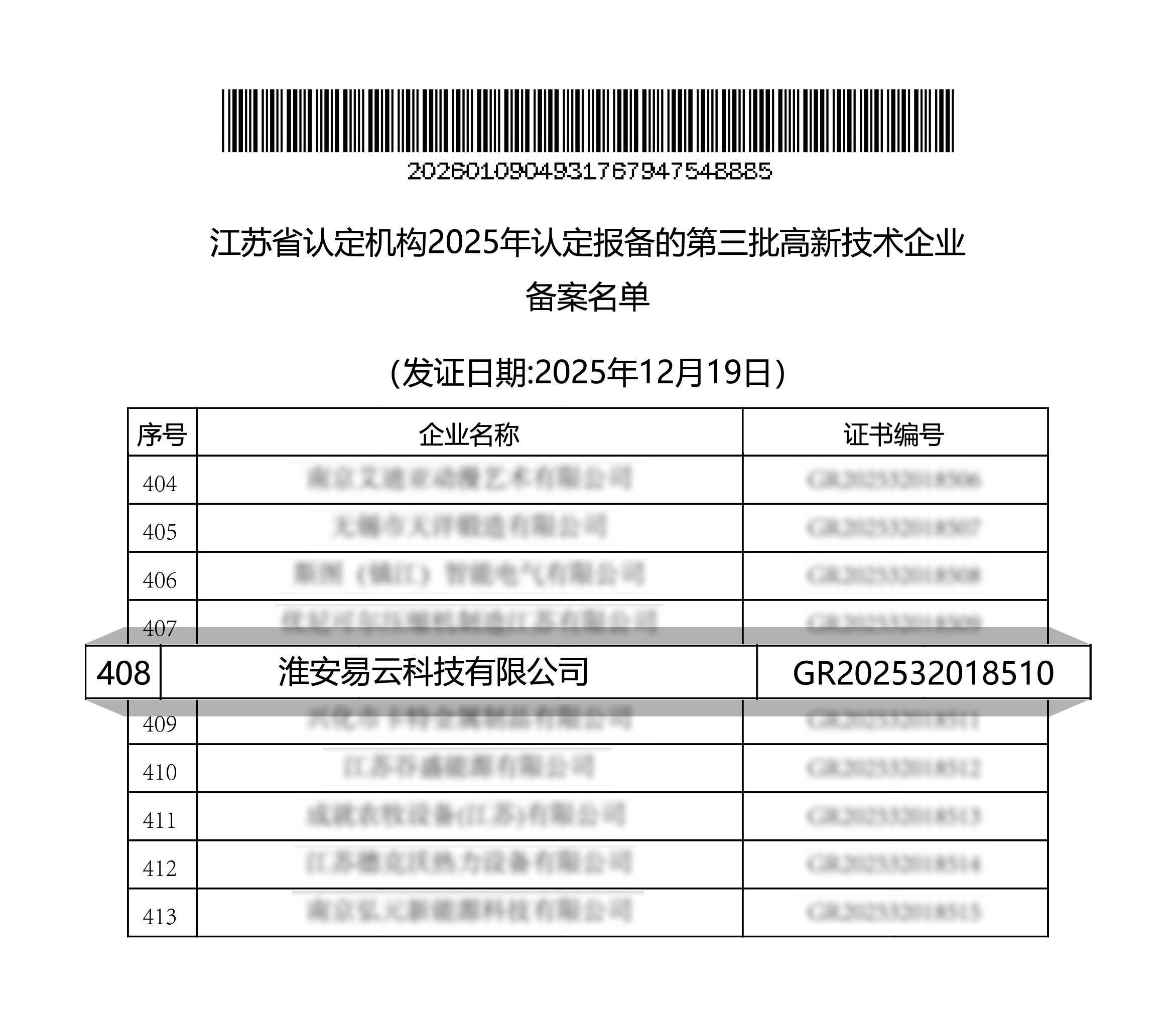 近日,全國高新技術企業(yè)認定管理工作領導小組辦公室正式公布2025年度高新技術企業(yè)認定名單,淮安易云科技有限公司憑借扎實的科技創(chuàng)新能力、完善的研發(fā)管理體系和突出的科技成果轉化成效,順利通過國家級“高新技術企業(yè)”認定。這是公司繼2019年首次獲此殊榮后,再次成功通過復審,充分彰顯了易云科技的科研投入水平和持續(xù)創(chuàng)新實力。