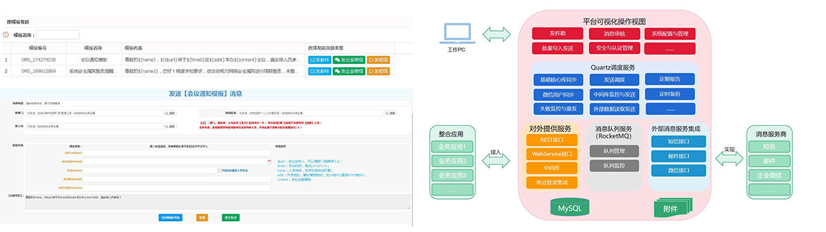 統(tǒng)一通信平臺是我司研發(fā)的產(chǎn)品,平臺使用Java EE技術(shù)體系開發(fā),提供統(tǒng)一消息(短信、郵件、企業(yè)微信等)的發(fā)送與管理服務(wù),提供規(guī)范標(biāo)準(zhǔn)化消息服務(wù)接口,便于整合與管控各類業(yè)務(wù)應(yīng)用的消息發(fā)送與使用需求。