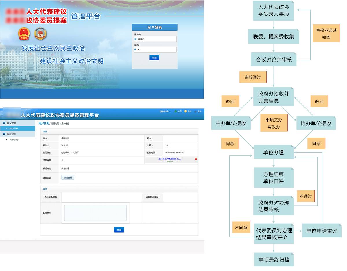 建議提案系統(tǒng)是我公司開發(fā)的,用于人大代表建議和政協(xié)委員提案辦理工作的業(yè)務(wù)平臺,可實現(xiàn)人大代表建議、政協(xié)委員提案的提交、查詢、跟蹤,政府辦交辦、督查、管理、催辦、查詢、統(tǒng)計,承辦單位的網(wǎng)上承辦、反饋、接受代表委員的考評和監(jiān)督。