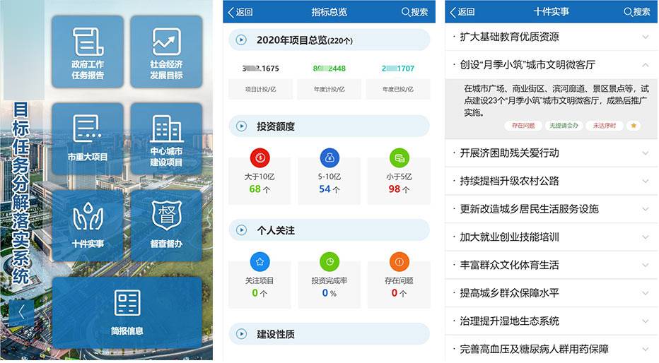 目標(biāo)任務(wù)分解落實(shí)系統(tǒng)根據(jù)淮安市領(lǐng)導(dǎo)要求建設(shè)開發(fā),主要是以解決各類信息上報(bào)及時(shí)性、準(zhǔn)確性和便捷性相關(guān)問題;提供政府工作報(bào)告任務(wù)、民生十件實(shí)事任務(wù)、市重大項(xiàng)目、中心城市建設(shè)項(xiàng)目、社會(huì)發(fā)展經(jīng)濟(jì)指標(biāo)、簡(jiǎn)報(bào)信息為中心,要求數(shù)據(jù)提供部門提供按月、季度等上報(bào)數(shù)據(jù)信息,牽頭部門負(fù)責(zé)把關(guān)審核數(shù)據(jù)。支持手工上報(bào)、批量導(dǎo)入、外部應(yīng)用對(duì)接獲取三種數(shù)據(jù)上報(bào)方式。系統(tǒng)各類數(shù)據(jù)以各種指標(biāo)維度展開統(tǒng)計(jì)與呈現(xiàn),為領(lǐng)導(dǎo)人員提供決策依據(jù)。